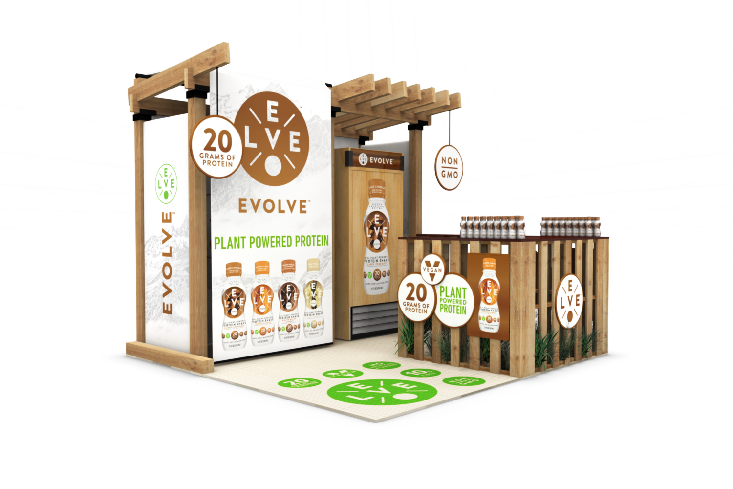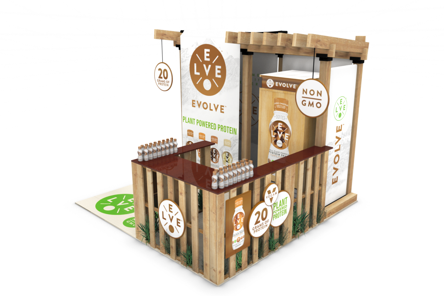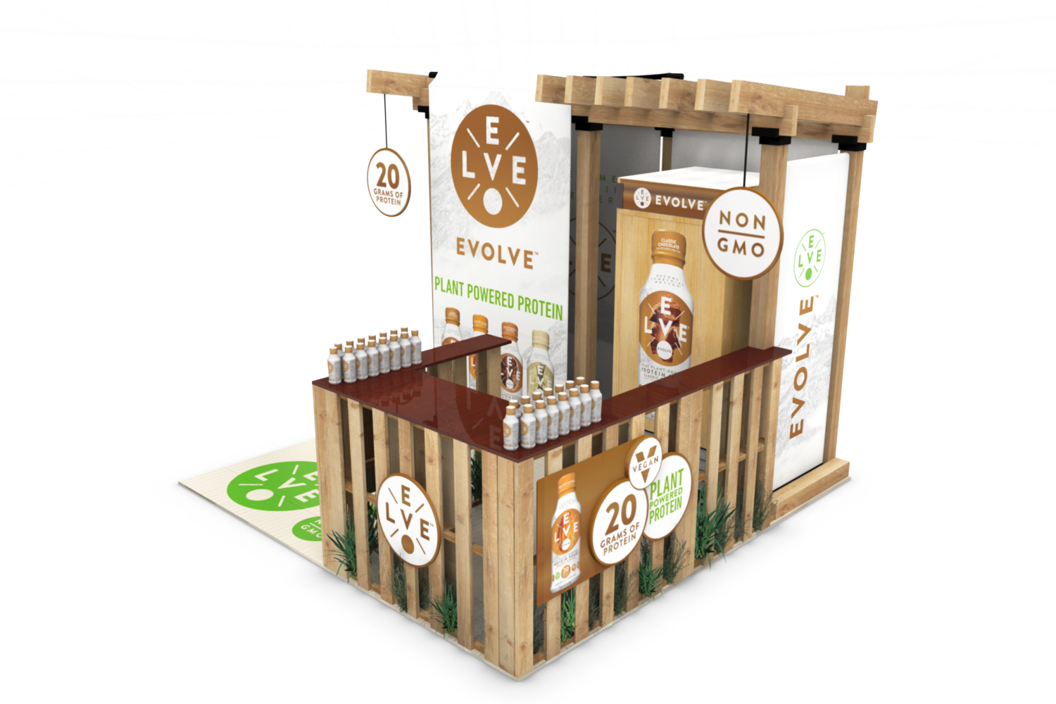 Cytosport approached us to create a unique tradeshow booth for their Evolve Plant Protein Series RTDs, which were also entirely created by AGD. They wanted a natural-looking 10′ x 10′ tradeshow booth that could easily be assembled and broken down by one person. We chose sturdy, yet light materials, and also repurposed wooden pallets as the sampling counter base. We used bamboo for the floor mat and accented the finished design with plantlife. This booth also featured a full-size branded refrigerator.