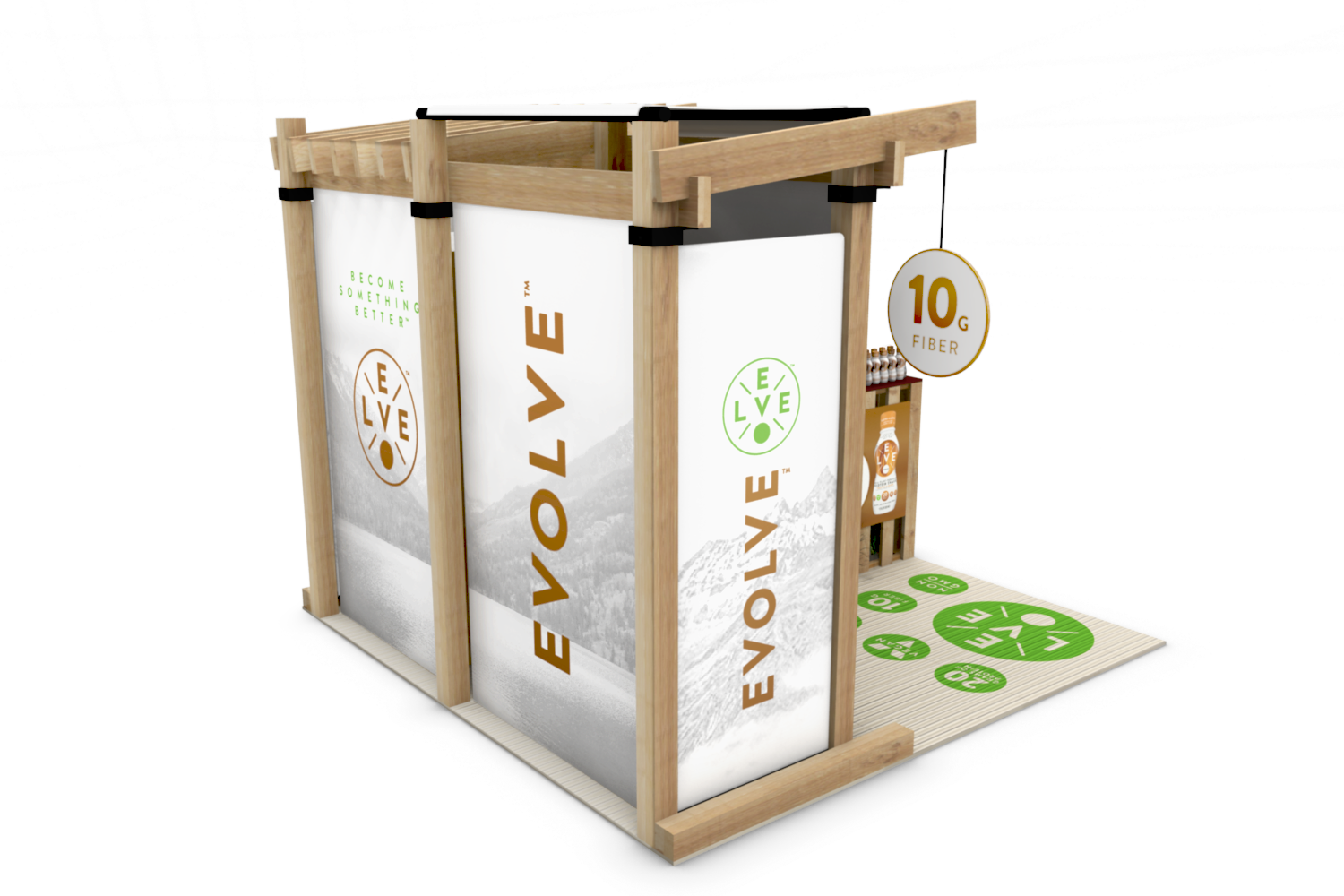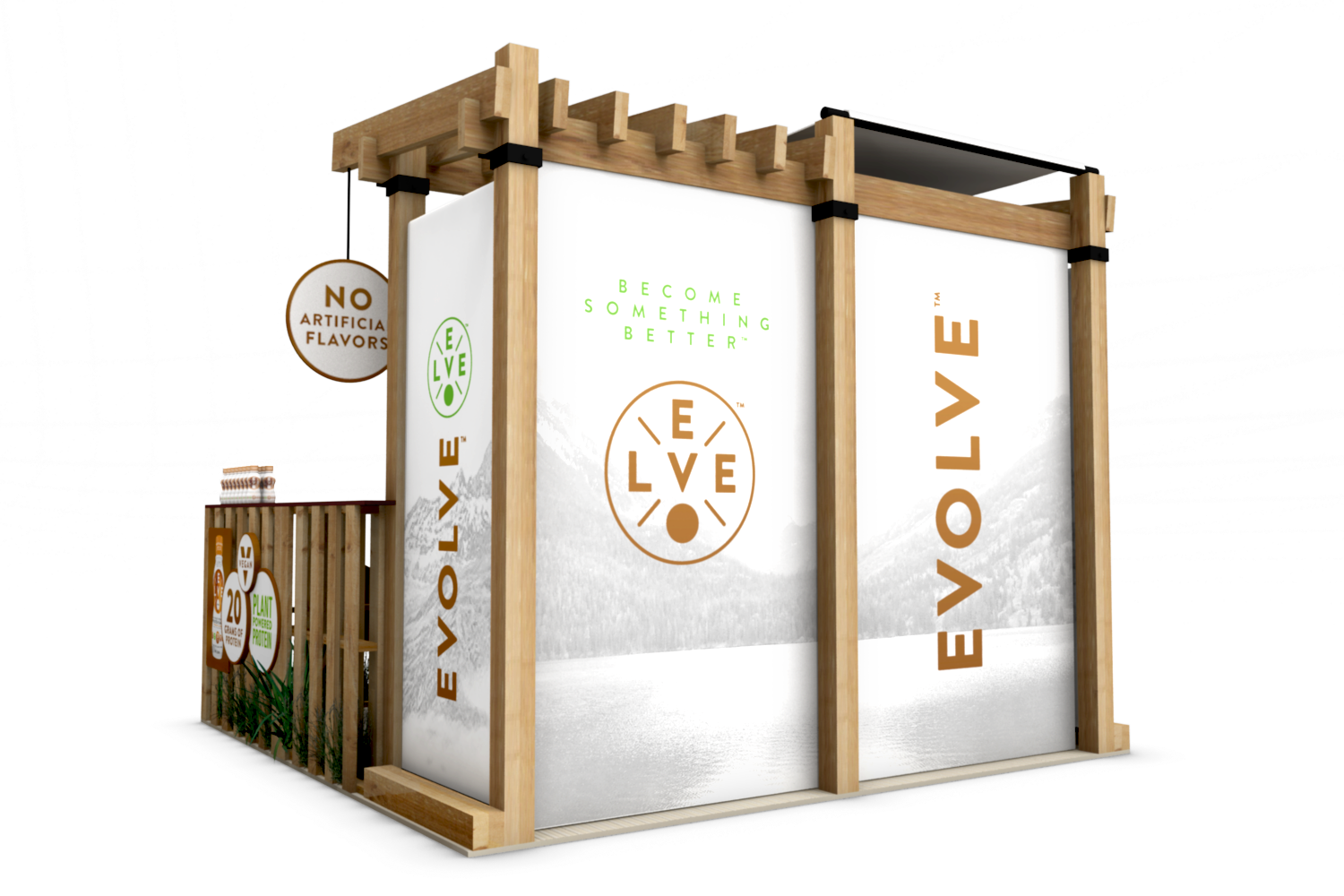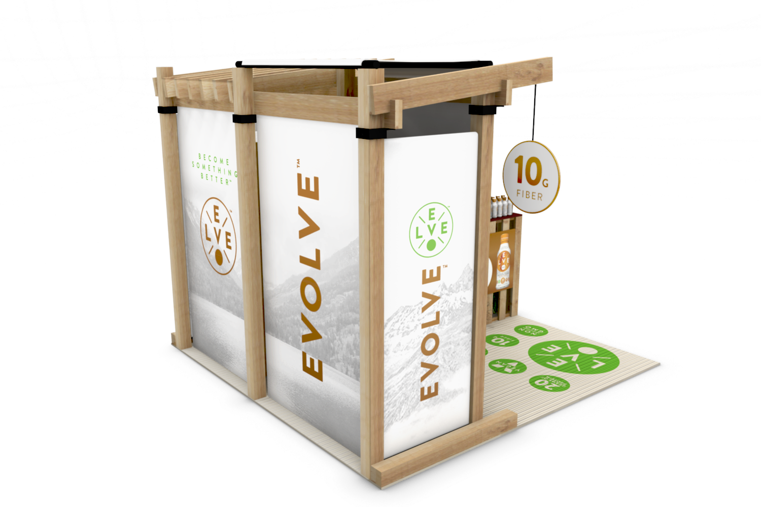 Cytosport approached us to create a unique tradeshow booth for their Evolve Plant Protein Series RTDs, which were also entirely created by AGD. They wanted a natural-looking 10′ x 10′ tradeshow booth that could easily be assembled and broken down by one person. We chose sturdy, yet light materials, and also repurposed wooden pallets as the sampling counter base. We used bamboo for the floor mat and accented the finished design with plantlife. This booth also featured a full-size branded refrigerator.
