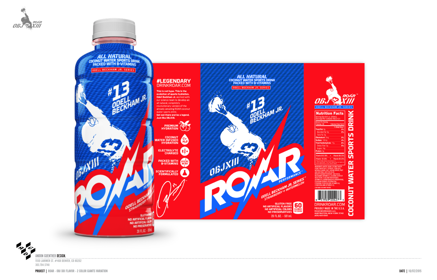 ROAR Beverage approached AGD to develop RTD label designs for their partnership with Odell Beckham Jr. in 2015-2016. We designed many different versions and landed on the one you see below. We also designed and produced point-of-sale materials, digital campaign creatives, and additional flavors aside from the OBJ13 signature flavor. We also gave the company brandmark a fresh new look.